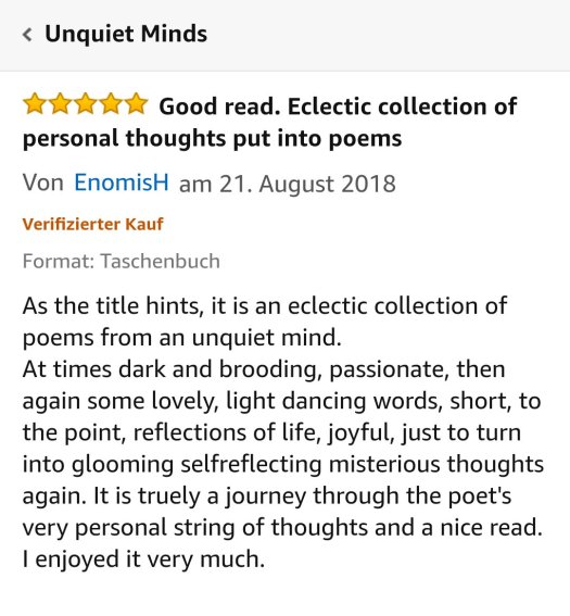 It was by sheer coincidence that I noticed a five star review for my book Unquiet Minds on Amazon.de. It is the first review on Amazon, and I have no idea who wrote it. I think, I don’t know them, but I am very grateful for these beautiful and kind words.