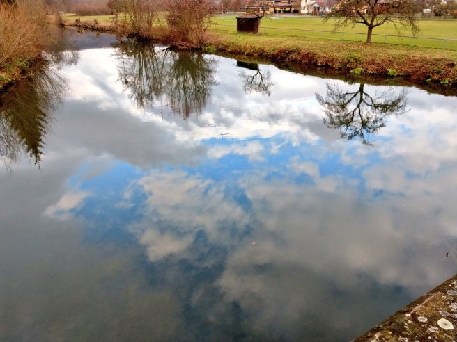 I took this picture yesterday. No filters, no tricks. I saw the reflection of the sky in the water and had to take the pic. My kids didn’t see it until they saw the picture. The angle is not perfect. If I had held the camera a little higher, I would have had the entire tree on the right in the picture. I think that would have made it even better.