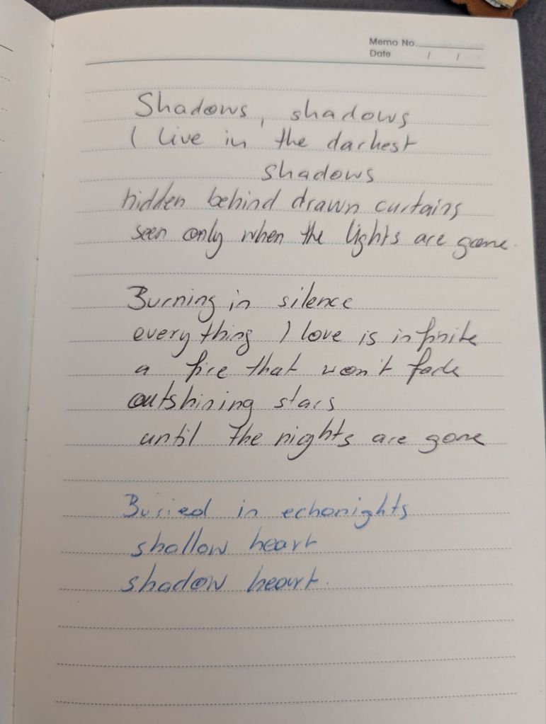 This one was written today. My pen broke – literally broke, hence the change of ink. It reminded me why, most often, I write with a fountain pen.