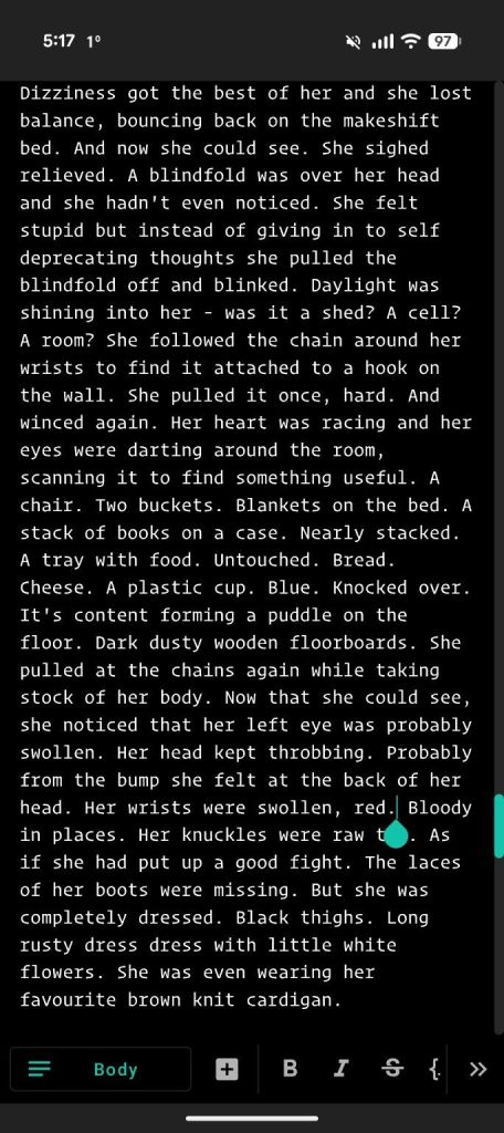 Posted on January 9, 2026 by CatherineIn the making A glimpse, a fragment of something unedited I am writing. Typos included. Written on an app called Jotterpad. Rate this:Share this:Tweet Click to email a link to a friend (Opens in new window) Email Click to share on WhatsApp (Opens in new window) WhatsApp Click to share on Mastodon (Opens in new window) Mastodon Click to share on Reddit (Opens in new window) Reddit Click to share on Threads (Opens in new window) Threads Click to share on Bluesky (Opens in new window) Bluesky Like Loading... Related