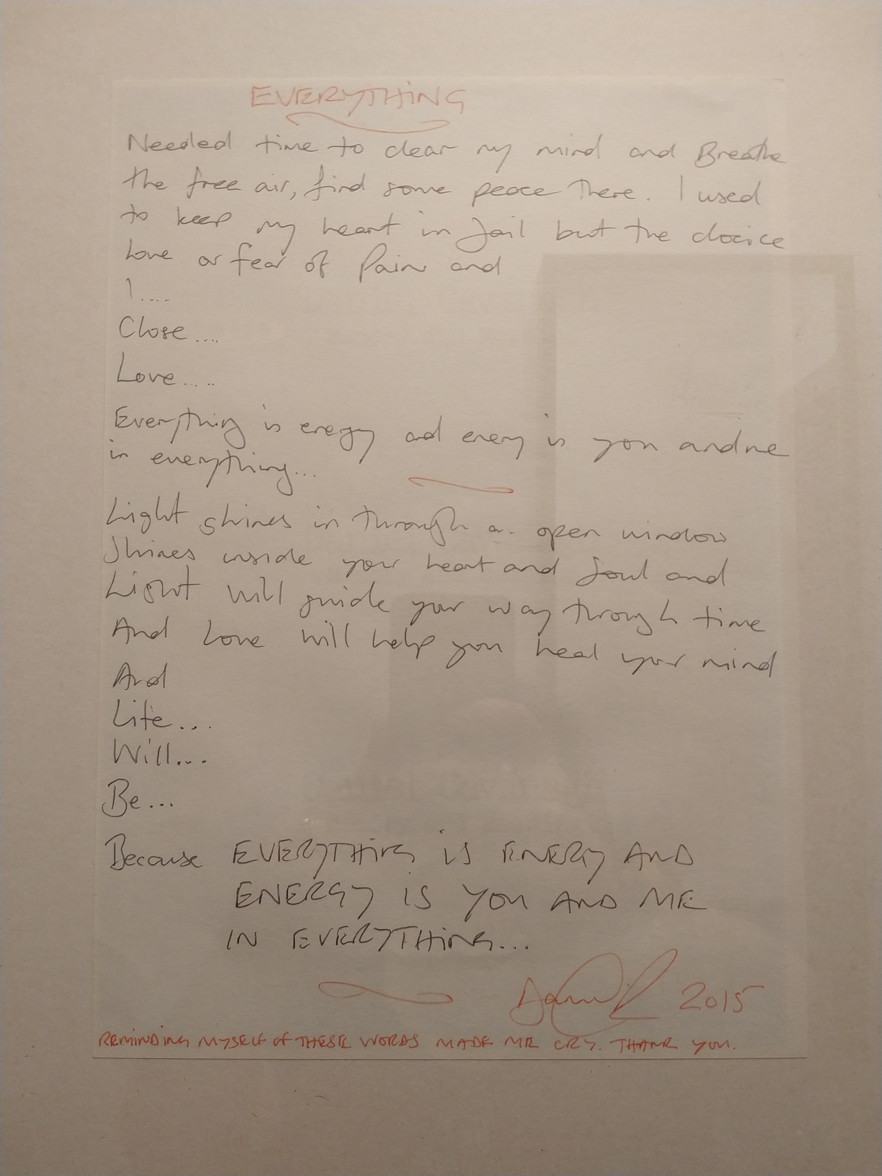 In 2014/2015, Daniel Cavanagh, founding member, songwriter/multi-instrumentalist of Anathema, launched a crowdfunding campaign for a solo album. It consisted of cover versions that held memories and meaning for the artist, hence the name “Memory and Meaning”. Of course, I supported one of the people who influenced most of my life. I ordered a handwritten lyric sheet for the song “Everything”.