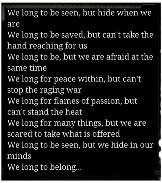 I was told that I am cold. I was told that I am strong. I even was told that I am amazing. I was told that I am too emotional and I was told that I am selfish. Maybe I am all of those things. In the end, the only thing that is real and true is that I am me. I am Cathy. I am flawed and damaged beyond repair. I am starving for something that I can’t accept, even if offered to me.